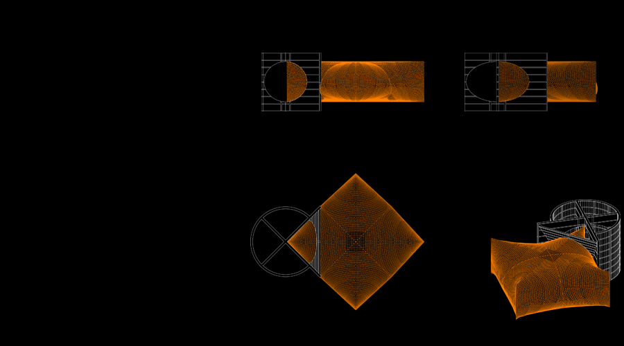 Evidence of this process at work can be sampled through the study of the tilted arches supporting the roof, which in their final iteration differ subtly from the versions presented on the blueprints. Initially placed as geometric analogues of the elliptical openings, the arches as built claim instead a ricocheted link to the interior corner of the intersecting voids. The sweep of the arch is traced directly to the line of this crossing, where the converging vectors, once properly edited within the spatial boundaries, create the amorphous object shown.