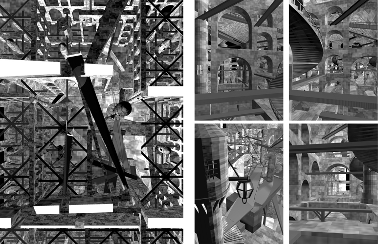 While the 2D picture-plane of the etching allows for a systematic stripping of the laws of perspectival construction, a translation of the view into a 3D environment attempts to recreate the illusion through the warping and selective displacement of the composing elements. This effectively simulates and exaggerates depth and overlap while maintaining the ambiguities of Piranesi's construct, where the act of extraction further proliferates the illusion.