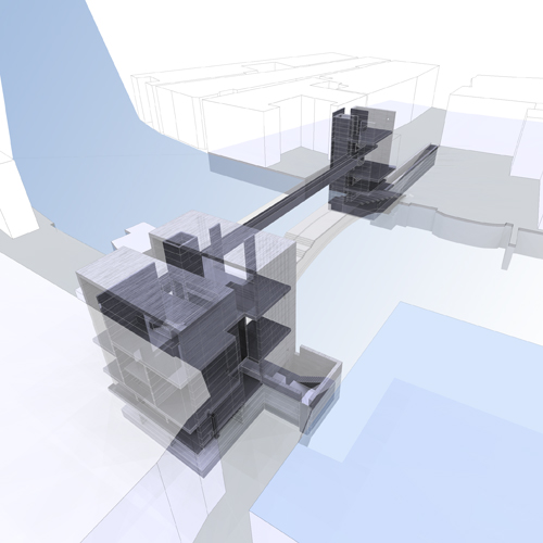 The bridges force a dialogue between the two structures, tying the museum, which focuses inward, to the cafeteria, which focuses outward to the city beyond.